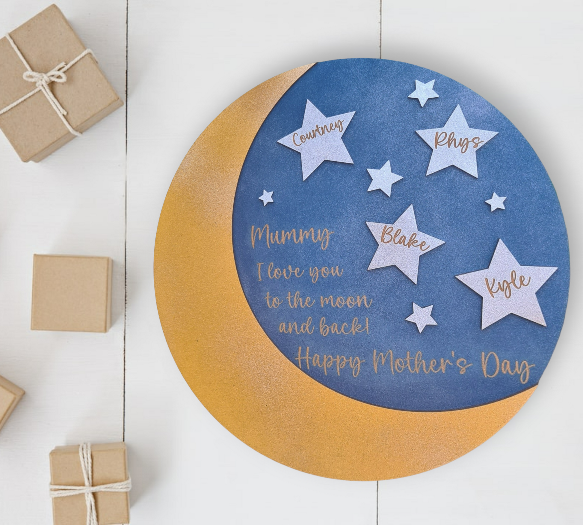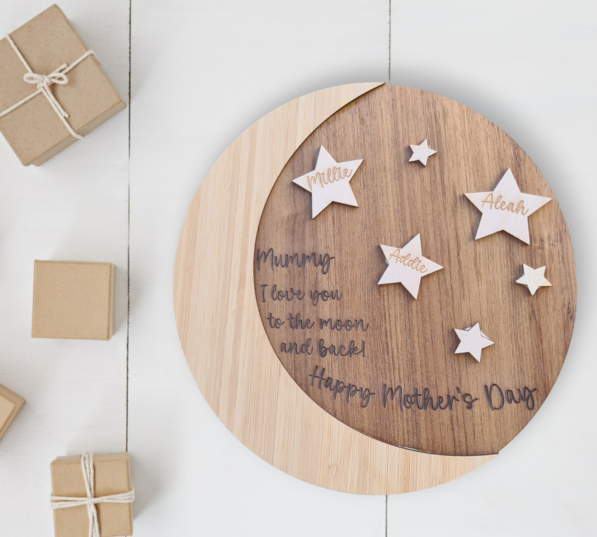 Show your love this Mother's Day with a customisable keepsake crafted with laser cut stars and/or paws and engraved names. Price varies depending on materials used.