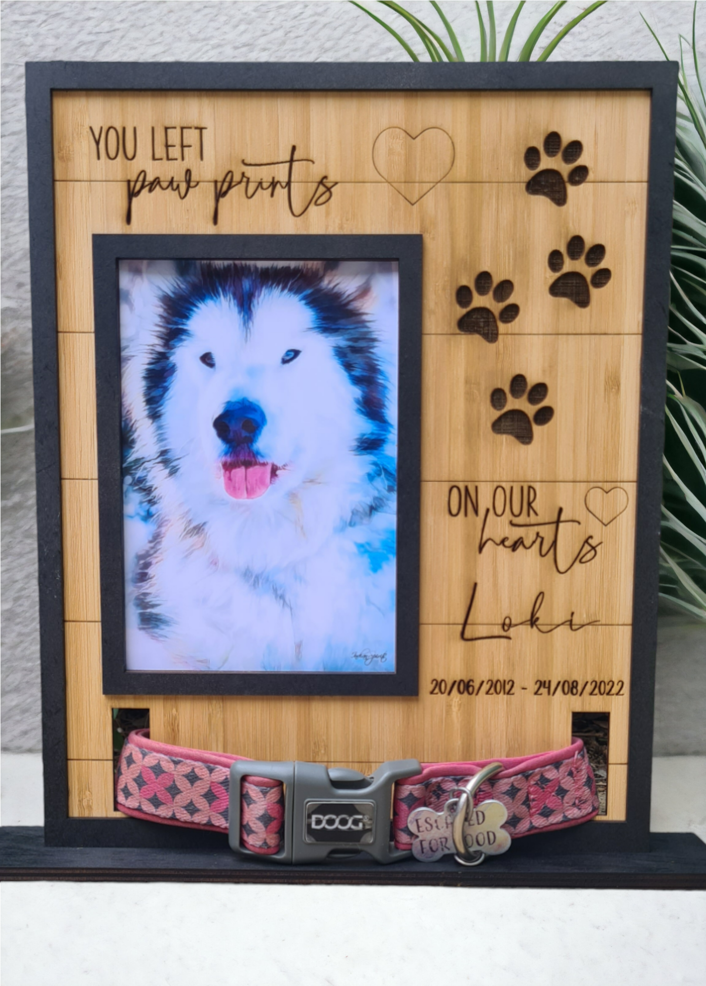This Pet Collar Memorial Stand offers a custom place for a photo and collar of your beloved pet.