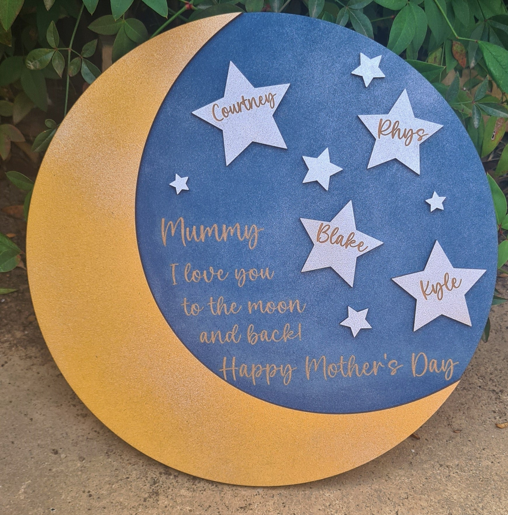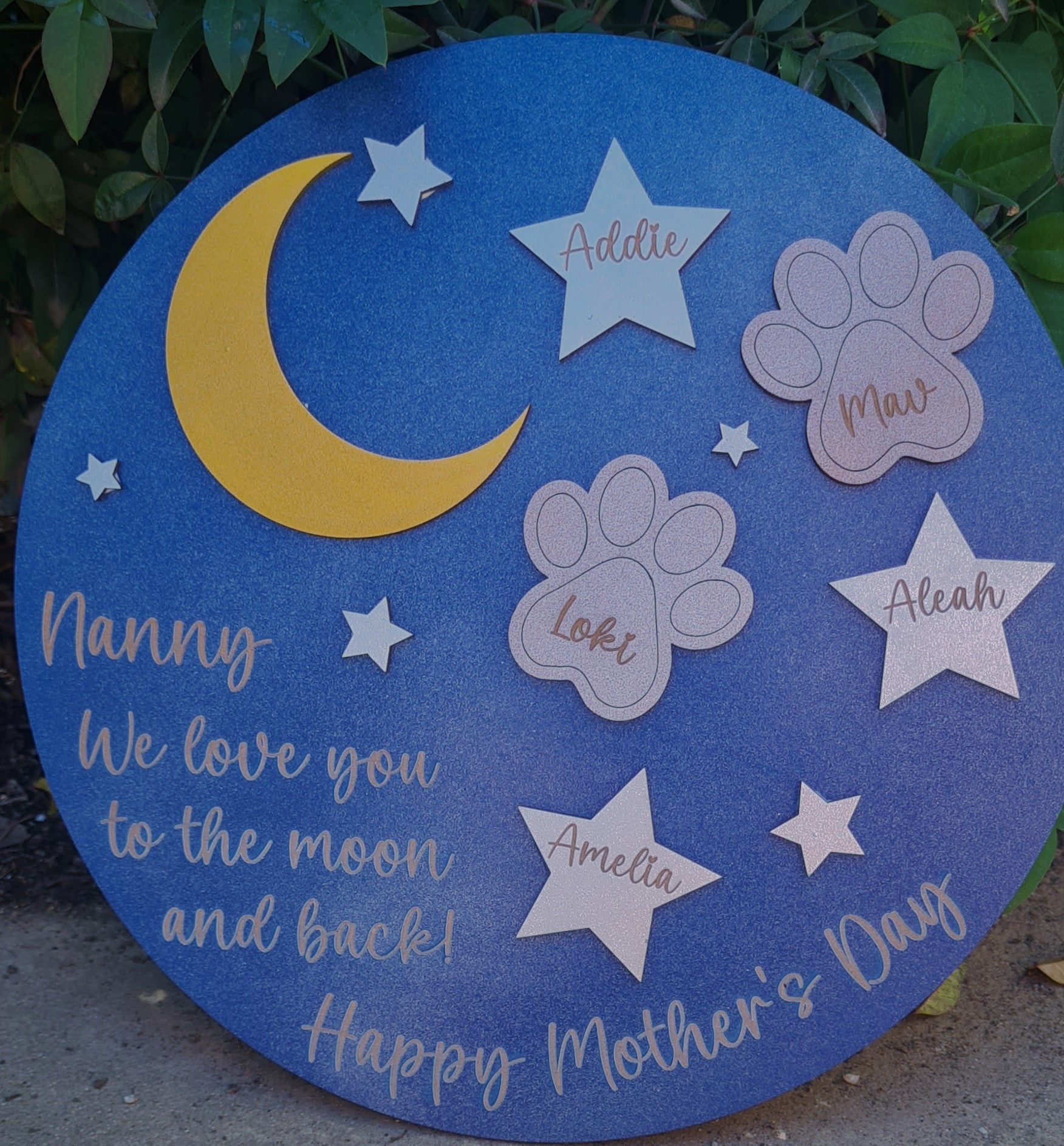 To the moon and stars disc. Hole can be added to hang.