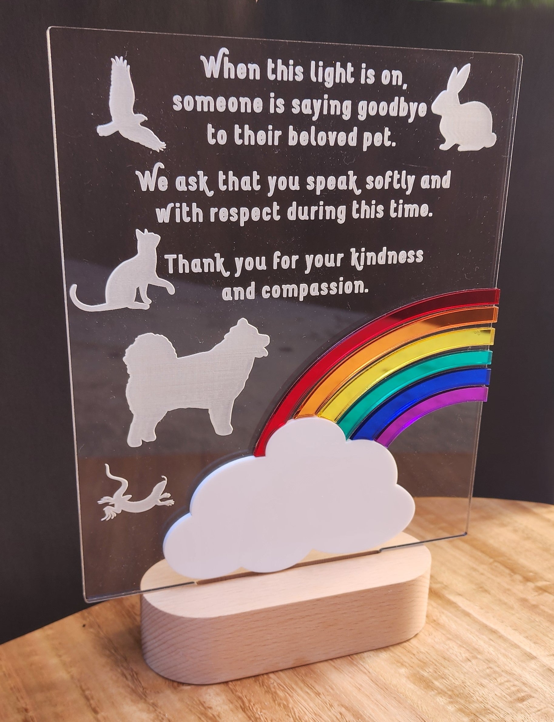 This acrylic lamp features a rainbow made from mirrored acrylic. A design that offers a gentle reminder of the difficult decision other clients may be going through while allowing them a more comforting and respectful way to say goodbye. Simplistic yet meaningful, it serves as a beautiful tribute to a beloved companion